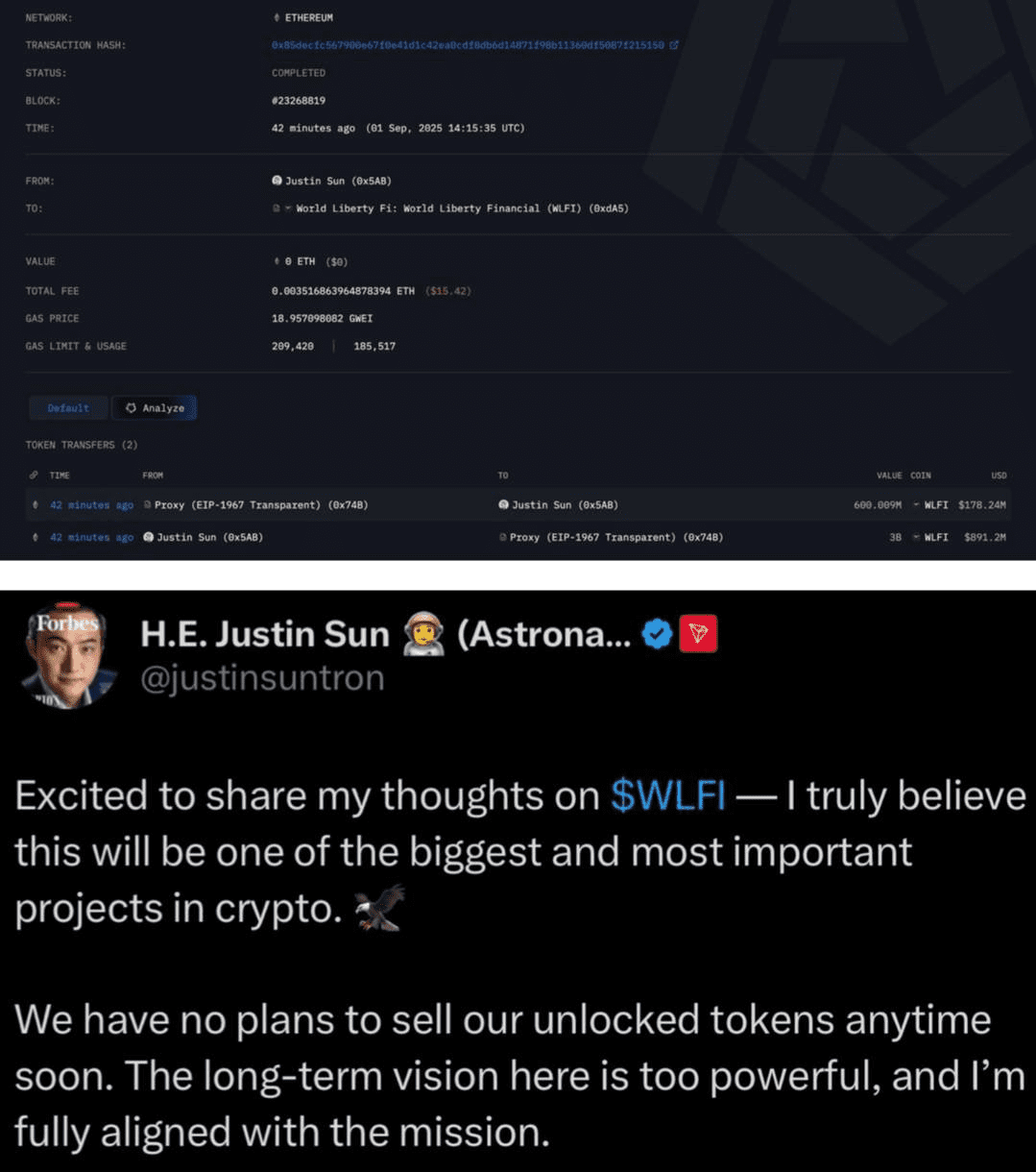از نظر معاملاتی، WLFI در نقطه حساسی قرار دارد. خرید با این FDV بالا پرریسک است و شورت‌ کردن هم به دلیل پشتوانه سیاسی و حمایتی خطرناک است. یک اتفاق جالب دیگر این بود که جاستین سان (بنیانگذار ترون) ۲۰ درصد از توکن‌های خود به ارزش ۱۷۸ میلیون دلار را آزاد کرد. البته پس از انتشار این خبر و احتمالاً برای آرام کردن‌ بازار ادعا کرد که قصد فروش ندارد.