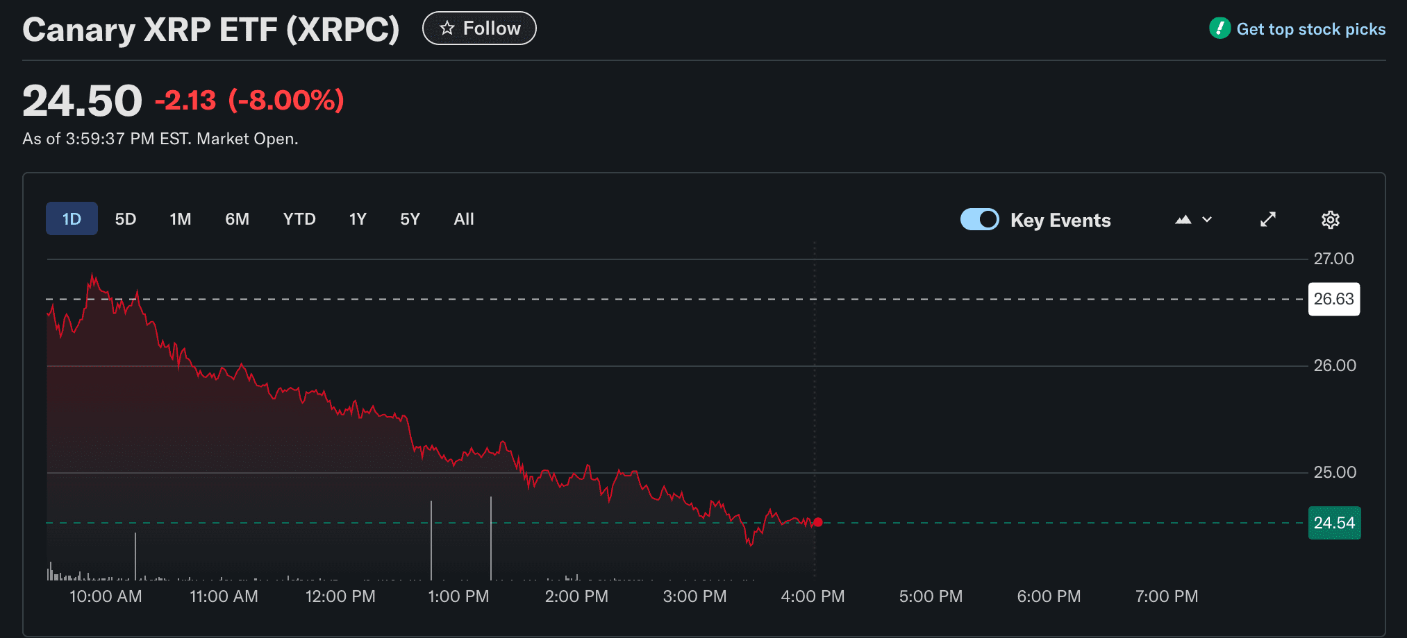 قیمت ETF ریپل Canary Capital در اولین حضور خود ۸ درصد کاهش یافت و از بالاترین سطح روزانه نزدیک به ۲۷ دلار به حدود ۲۴.۵۰ دلار رسید. این در حالی است که قیمت ریپل کاهش متوسط ۲ درصدی را طی ۲۴ ساعت گذشته تجربه کرد و به ۲.۲ دلار رسید.