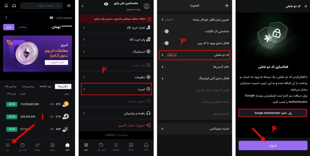 پس از دانلود و نصب برنامه Google Authenticator، باید وارد بخش تنظیمات حساب کاربری خود در نوبیتکس شویم. در صورتی که از وبسایت نوبیتکس استفاده میکنید به آدرس nobitex.ir/panel/profile/security مراجعه کرده و در صورتی که از اپلیکیشن نوبیتکس استفاده میکنید، مراحل تصاویر زیر را دنبال کنید.