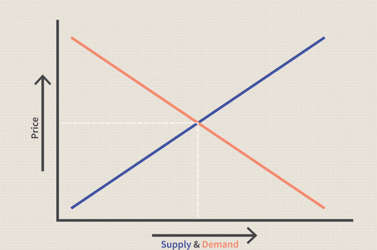 نقطهای که در آن عرضه و تقاضا با هم برابر میشوند، قیمت تعادلی (Equilibrium Price) نام دارد. در این نقطه، نه کمبود وجود دارد و نه مازاد؛ یعنی بازار در حالت تعادل است.