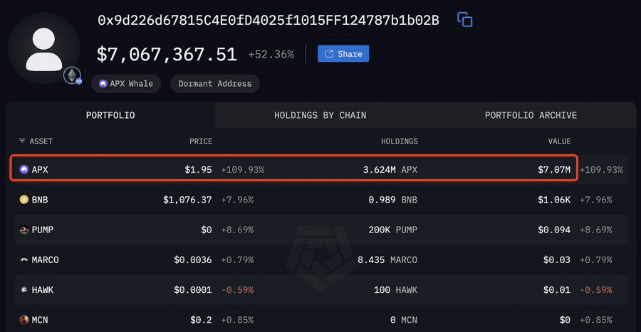 به گزارش کوین تلگراف، یک تریدر که در سال ۲۰۲۲ حدود ۲۲۶٬۰۰۰ دلار APX خریده بود، اکنون داراییاش به بیش از ۷ میلیون دلار رسیده است. این سود پس از جهش ۱۲۰ درصدی APX در پی آغاز فرآیند ارتقای ASTER swap رقم خورد. طبق دادههای Arkham Intelligence، این کیف پول در سال ۲۰۲۲ تعداد ۳.۶۲ میلیون APX را در قیمت کمتر از ۰.۰۷ دلار خریداری کرده بود. با رسیدن قیمت به حدود ۱.۹۵ دلار، ارزش این داراییها بیش از ۷ میلیون دلار برآورد میشود. APX طی ۲۴ ساعت گذشته به اوج تاریخی ۱.۹۸ دلار رسید و ارزش بازار آن به ۸۲۷ میلیون دلار و حجم معاملات روزانه به ۷۹ میلیون دلار افزایش یافت. این توکن اکنون نسبت به کف تاریخی خود در سال ۲۰۲۲ نزدیک به ۸٬۰۰۰ درصد رشد داشته است. APX، توکن بومی APX Finance است؛ یک صرافی غیرمتمرکز روی BNB Chain و Arbitrum که معاملات مشتقات، اهرم و فرصتهای سودآور برای تأمینکنندگان نقدینگی ارائه میدهد.