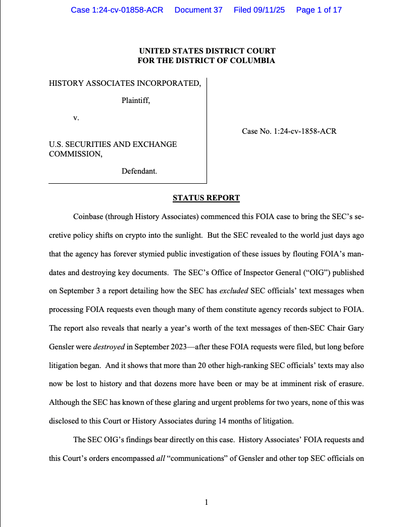 به گزارش کوین تلگراف، صرافی کوین بیس شکایتی رسمی علیه کمیسیون بورس و اوراق بهادار آمریکا (SEC) مطرح کرده است. دلیل این اقدام، حذف نزدیک به یک سال پیامهای متنی گری گنسلر، رییس سابق SEC و برخی مقامات ارشد عنوان شده که بنا به گزارش بازرس کل ناشی از «خطاهای قابل اجتناب» بوده است. کوین بیس میگوید SEC در پاسخ به درخواستهای مکرر FOIA در سالهای ۲۰۲۳ و ۲۰۲۴، جستجوی کامل سوابق از جمله پیامهای گنسلر را انجام نداده است. این شرکت از دادگاه خواسته SEC را ملزم به ارائه تمامی پیامها و اسناد، بهویژه درباره تغییر اتریوم به الگوریتم اثبات سهام (PoS)، کند. همچنین پیشنهاد برگزاری جلسه دیگری پس از کشف اسناد برای بررسی اقدامات جبرانی مانند هزینه وکلای حقوقی مطرح شده است. SEC در واکنش، شفافیت را «بنیادی» دانست و وعده داد از تکرار این خطا جلوگیری شود. این پرونده در ادامه اختلافات گسترده SEC و صرافیهای کریپتویی قرار دارد.