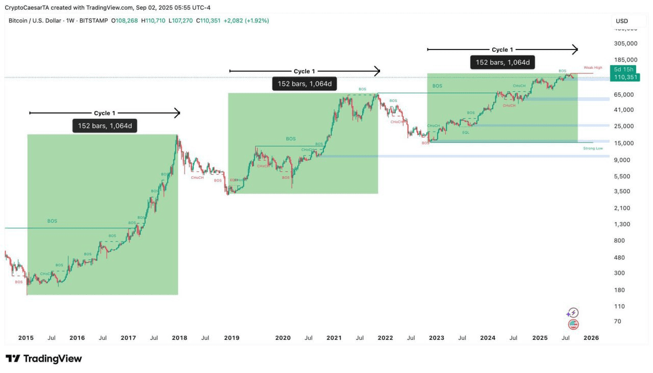 بررسی نمودار هفتگی بیت کوین نشان میدهد دو چرخه قبلی هرکدام حدود ۱۵۲ هفته طول کشیده و سپس وارد اصلاح شدهاند. اگر تاریخ تکرار شود، چرخه فعلی نیز زمان زیادی برای ادامه ندارد و احتمال اصلاح پیشرو وجود دارد. با این حال، برخی کارشناسان معتقدند که الگوی سنتی چرخهها دیگر معتبر نیست. دلیل اصلی این دیدگاه حضور گستردهتر نهادهای مالی و سرمایهگذاران سازمانی در بازار است که میتواند پایداری و رشد مداومتری برای بیت کوین رقم بزند. در این سناریو، به جای ریزشهای سنگین، تنها اصلاحهای جزئی انتظار میرود. اکنون پرسش اصلی این است که آیا بیت کوین در آستانه پایان یک چرخه تاریخی دیگر قرار دارد یا وارد عصر جدیدی از رشد پایدار شده است؟ پاسخ به این پرسش در نهایت به تصمیم و رفتار بازار بستگی دارد.