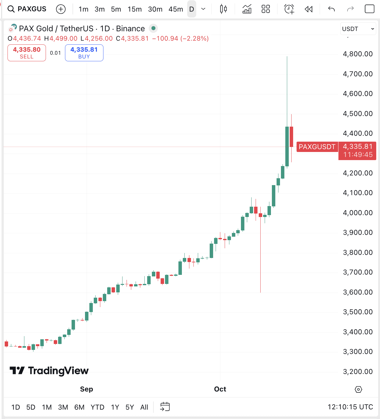 در جریان نوسانات بازار کریپتو، توکن پکس گلد (استیبل کوین طلا) در صرافی بایننس ناگهان تا سطح ۵٬۱۰۶ دلار رشد کرد. در حالی که قیمت اسپات طلا حدود ۴٬۳۶۴ دلار بود. این جهش غیرمنتظره به دلیل لیکویید شدن پوزیشنهای شورت در بازار مشتقات بایننس رخ داد که منجر به لیکویید شدن ۶.۸۲ میلیون دلار معامله شد. در ادامه، قیمت PAXG در بازار جهانی نیز حدود ۸ درصد افزایش یافت و تا بیش از ۴٬۸۰۰ دلار بالا رفت، اما سپس مجدداً به محدوده ۴٬۴۳۶ دلار بازگشت.