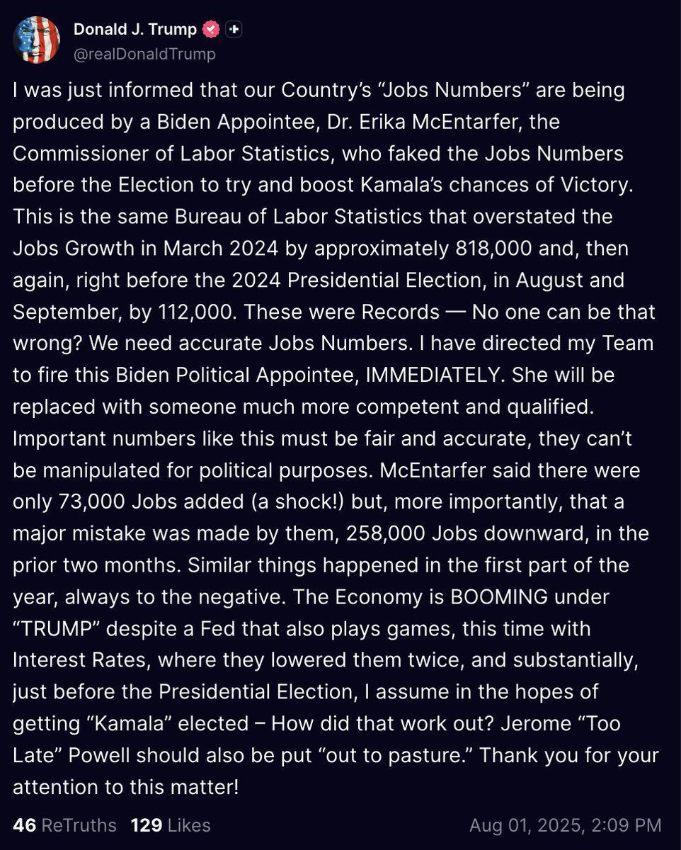 به گزارش ان‌بی‌سی نیوز، دونالد ترامپ پس از انتشار گزارش ضعیف اشتغال، کمیسر اداره آمار کار (BLS)، یعنی اریکا مک‌انترفر را برکنار کرد. او مدعی شد آمار اشتغال توسط منصوبان بایدن دست‌کاری شده‌ و خواستار دقت و بی‌طرفی در این داده‌ها شد. البته هیچ مدرکی ارائه نکرد. گزارش BLS نشان داد تنها ۷۳٬۰۰۰ شغل در ماه جولای (تیر) ایجاد شده‌ که بسیار کمتر از پیش‌بینی‌ها بود.
