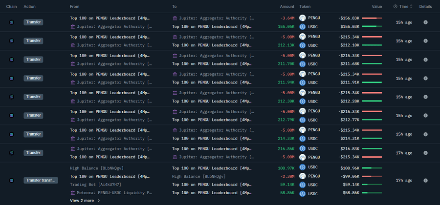 به گزارش کریپتوپوتیتو، یک نهنگ اخیراً ۷۳.۶۴ میلیون توکن PENGU را به ارزش تقریبی ۳.۱۳ میلیون دلار USDC با میانگین قیمت ۰.۰۴۲ دلار به فروش رسانده است. این معامله برای او سود چشمگیر ۲.۱۳ میلیون دلاری به همراه داشت. طبق دادههای آنچین، این نهنگ حدود سه ماه پیش همین مقدار PENGU را تنها با ۱ میلیون دلار خریداری کرده بود. بنابراین در مدت کوتاهی توانست بیش از دو برابر سرمایه اولیه خود سود کسب کند. چنین حرکات بزرگی در بازار معمولاً توجه زیادی را به خود جلب میکند، زیرا میتواند بر احساسات معاملهگران خرد تأثیر بگذارد. آدرس این کیف پول که معامله را انجام داده، به صورت عمومی 4MpYci2vGPiwmtsPu4LHgfuy3h4skEoEZZbmSkgkx94G ثبت شده است.