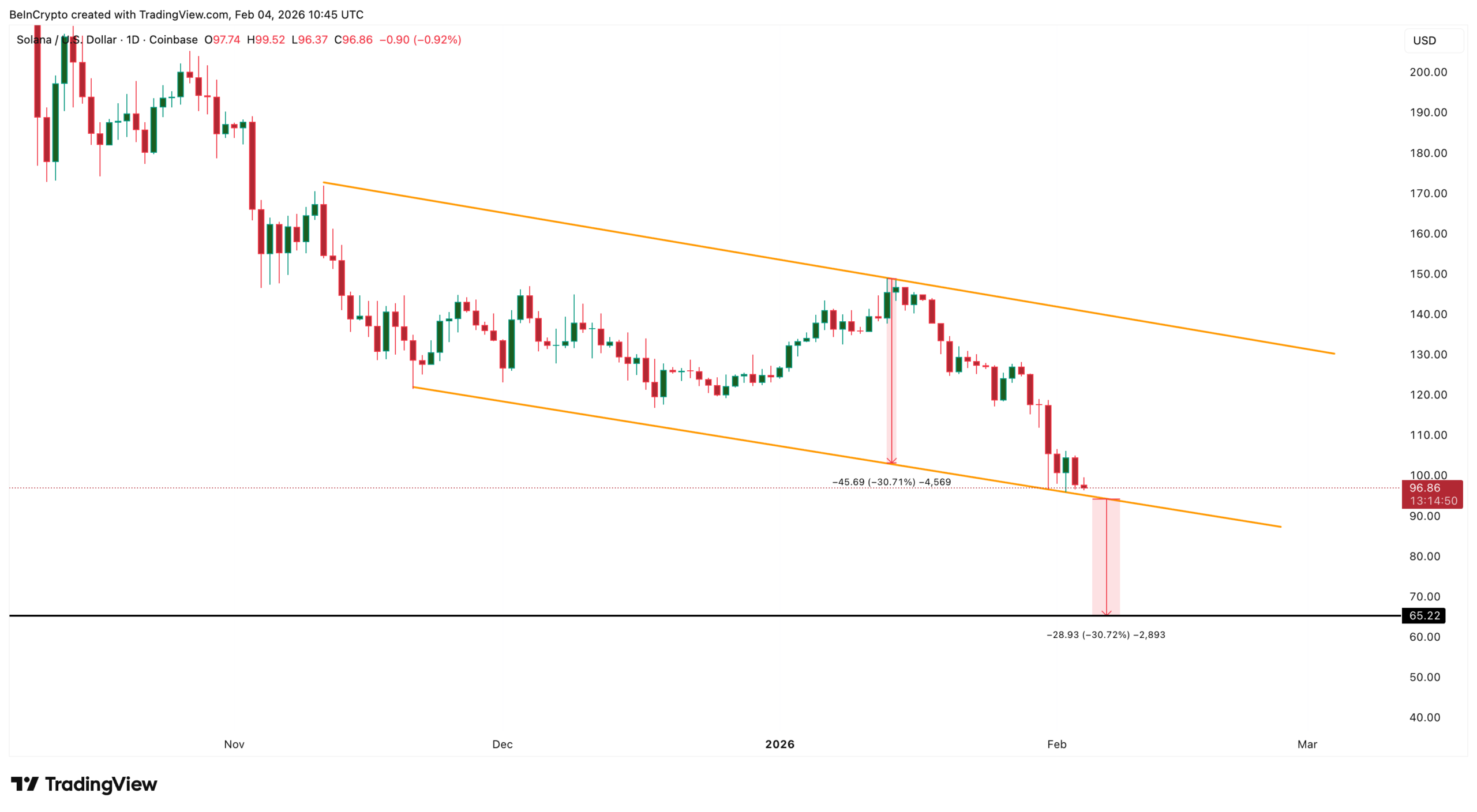 ساختار تکنیکال هم ضعف مشاهده‌شده در داده‌های درون‌زنجیره‌ای را منعکس می‌کند. قیمت SOL همچنان در یک کانال نزولی قفل شده‌ که از نوامبر قیمت را به سمت پایین هدایت کرده است. پس از از دست دادن‌ حمایت مهم ۹۸ دلار، قیمت اکنون نزدیک به ۹۶ دلار و نزدیک به مرز پایینی کانال، معامله می‌شود.