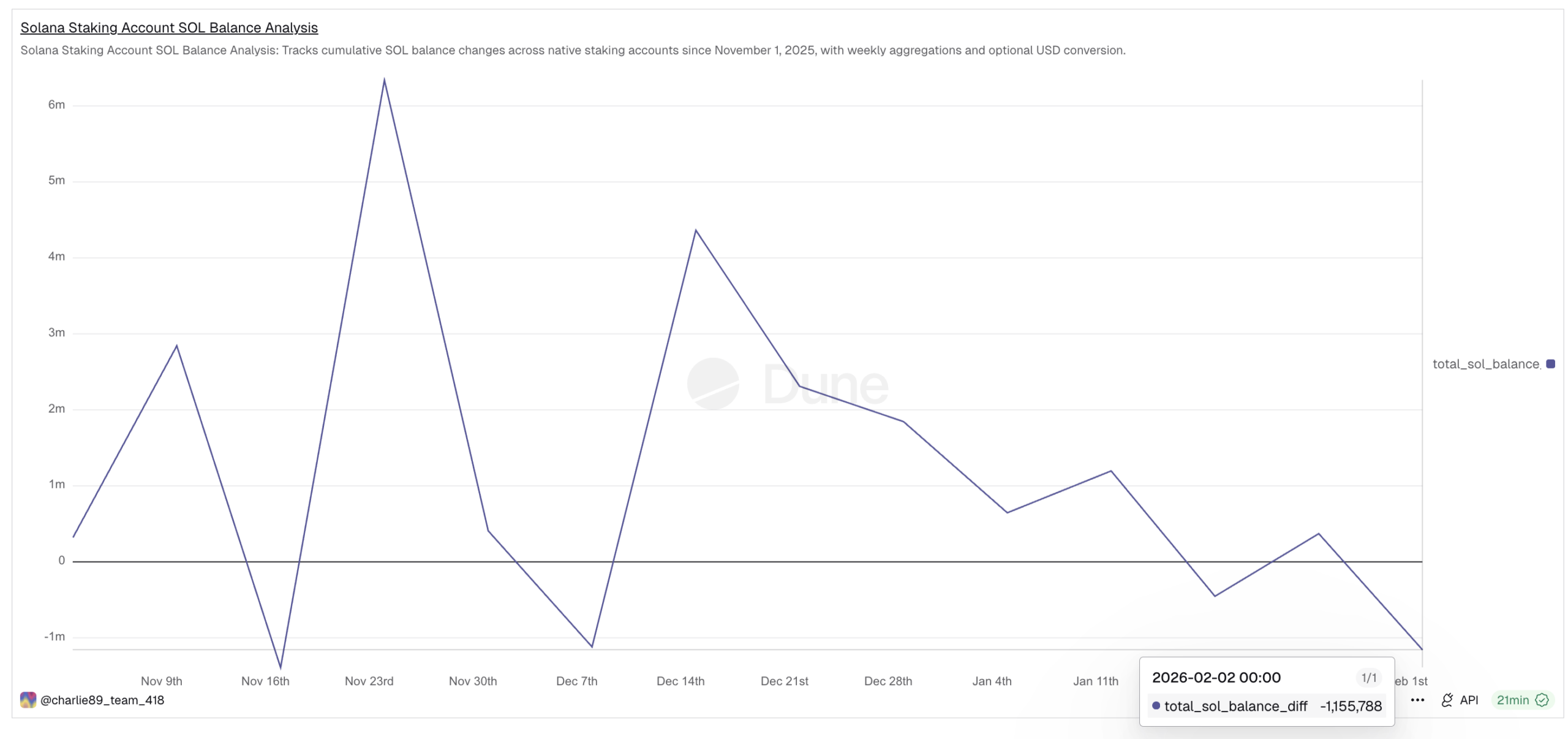 اکنون این روند کاملاً معکوس شده است. تا اواسط ژانویه (دی)، جریان‌های هفتگی استیکینگ منفی شده بودند. هفته منتهی به ۱۹ ژانویه، استیکینگ خالص حدود ۴۴۹,۸۱۹- SOL بود. تا ۲ فوریه این رقم به ۱,۱۵۵,۷۸۸- SOL رسید که افزایشی تقریباً ۱۵۰ درصدی در آن‌استیکینگ طی دو هفته است.