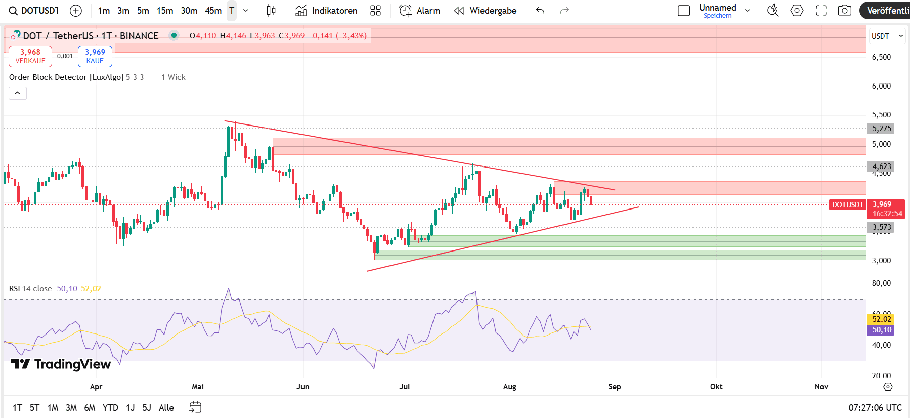 پولکادات (DOT) در حال حاضر درون یک الگوی کنج قرار دارد که معمولاً یک الگوی صعودی در تحلیل تکنیکال محسوب می‌شود. این الگو نشان می‌دهد که فشار فروش کاهش یافته و قیمت پولکادات می‌تواند به‌زودی از این ساختار خارج شود.