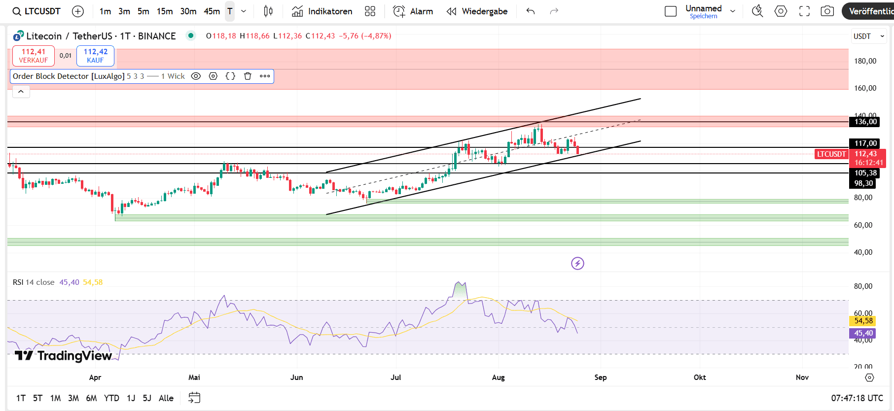 نمودار روزانه قیمت لایت کوین نشان می‌دهد که این آلت کوین همچنان در یک کانال صعودی میان‌مدت در حال نوسان است. پس از رشد قابل توجه اخیر، قیمت آن تا محدوده ۱۱۲ دلار اصلاح کرده و اکنون روی حمایت خط پایینی کانال مذکور قرار گرفته است. این سطح در گذشته چند بار به‌عنوان حمایت عمل کرده و می‌تواند نقطه شروع یک بازگشت جدید باشد. در روزهای اخیر اخبار مربوط به ETFهای اسپات لایت کوین هم قوت کرده و توجه معامله‌گران زیادی را به آن جلب کرده است.