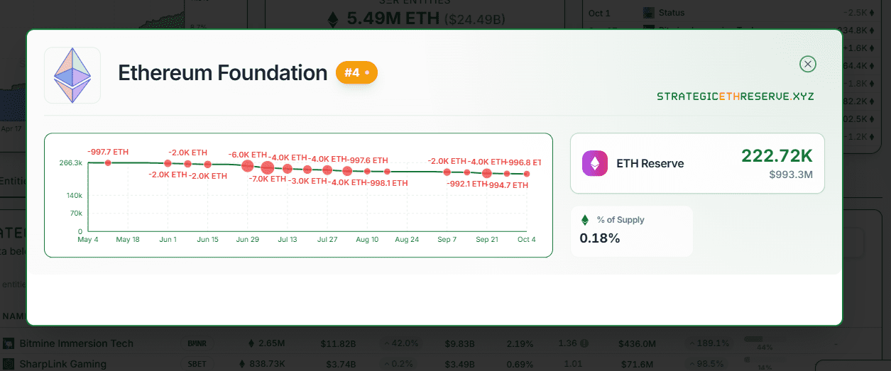 در همین حال، طبق دادههای ذخیره استراتژیک اتریوم، این هفدهمین فروش ETH توسط این بنیاد در سال ۲۰۲۵ است. موجودی باقیمانده آن در حال حاضر نزدیک به ۲۲۲,۷۲۰ واحد ETH است که با قیمت فعلی اتریوم، تقریباً ۱ میلیارد دلار ارزش دارد.