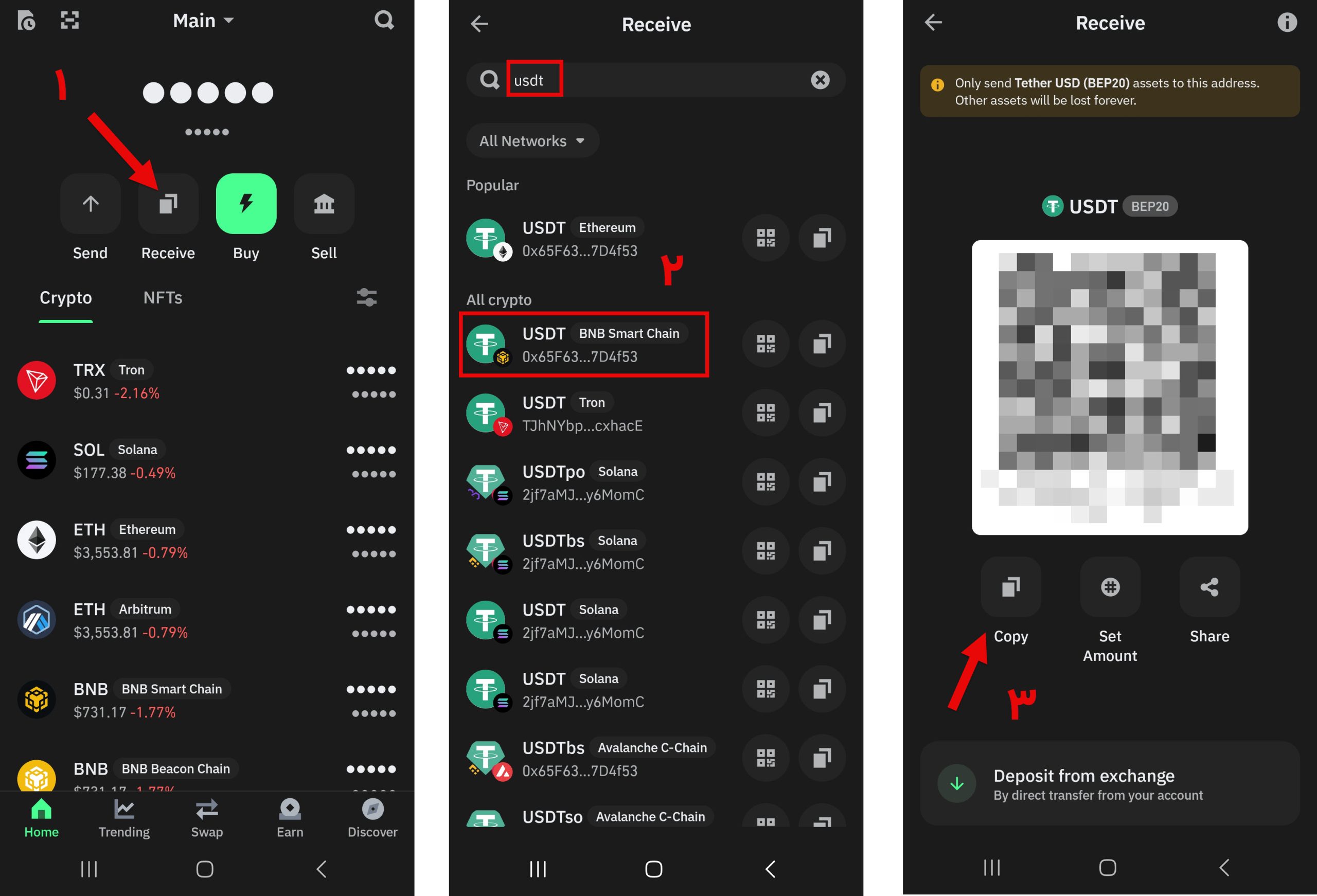 فرض کنید بعد از خرید تتر در نوبیتکس، قصد دارید آن را به تراست والت انتقال دهید. وارد بخش Receive در تراست ولت شده و نام Tether یا نماد آن USDT را جستوجو کنید.