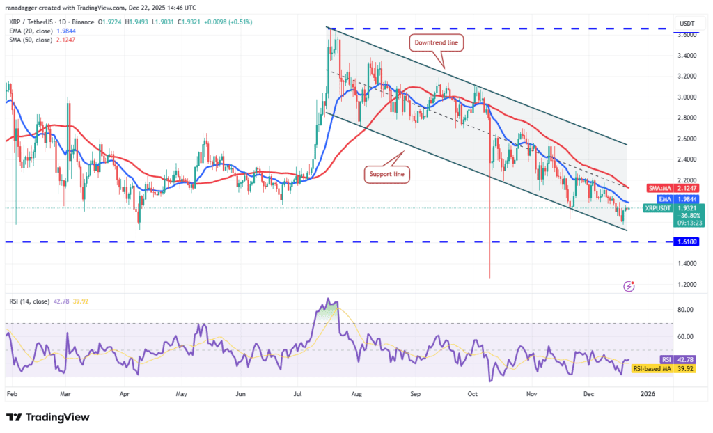 بازگشت XRP از خط حمایت کانال نزولی موجود در تایم فریم یک روزه، در برابر میانگین متحرک نمایی (EMA) ۲۰ روزه (۱.۹۸ دلار) با مقاومت روبرو است.